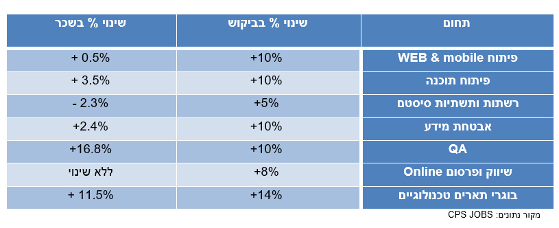 ברבעון השני של 2016 הביקושים העלו את ממוצע המשכורות הטכנולוגיות הכוללות בכ-4.6% לעומת הרבעון השני של 2015. כאשר שני תחומים מרכזיים דחפו את הממוצע באופן משמעותי והם העלייה בשכר בוגרי התארים הטכנולוגים ללא ניסיון קודם, אשר שכרם עלה בכ-11.5% ומשרות אבטחת האיכות שהממוצע בהם עלה בכ- 16.8%. עם זאת, העוסקים בתחומי הרשתות והתשתיות חוו ירידה ממוצעת במשכורות של כ- 2.3%.