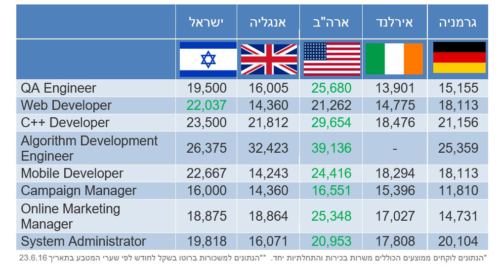 בנוסף, CPS JOBS השמה להייטק בדקה את ממוצעי השכר הישראלים במקצועות נבחרים בהייטק והשוותה אותם לממוצעים המפורסמים באתר Glassdoor (מאתרי חיפוש המשרות הגדולים בעולם). מהטבלה ניתן לראות שהמשכורות בהייטק הישראלי שניות רק לארה"ב בכל תחומי ההייטק: פיתוח, אבטחת איכות, שיווק ותשתיות וניהול רשתות. יתרה מזו, בממוצע השכר בפיתוח WEB השכר הממוצע בישראל גבוה מכל הארצות שנבדקו (ומעל ל-50% מהשכר הממוצע באירלנד ואנגליה).