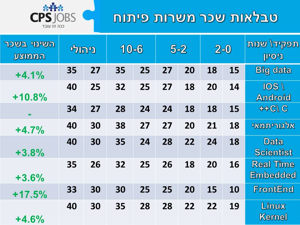 הנתון הבולט ביותר הקופץ מן הטבלאות הוא עלייה של כ- 17.5% בשכר הממוצע של מפתחי Front end לעומת אותה התקופה אשתקד, מפתח מנוסה בתחום עם מעל ל-6 שנות ניסיון יוכל להשתכר עד ל- 30 אלף ש"ח בחודש.